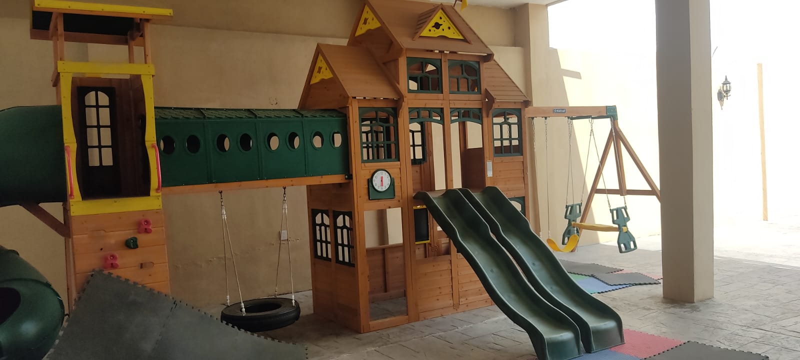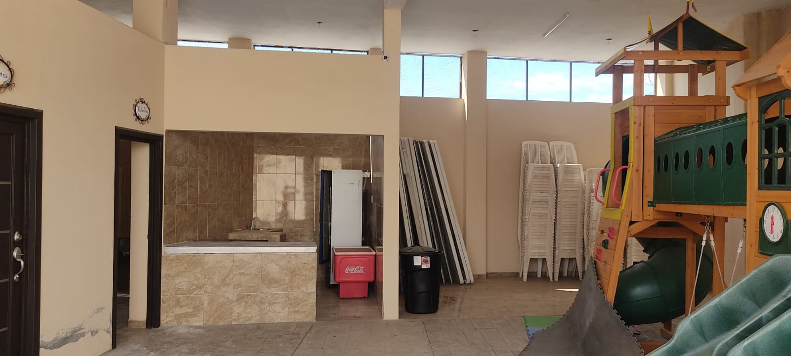El salón cuenta con un área de juegos infantiles.